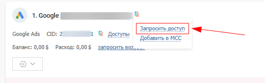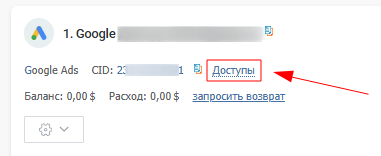 1. Нажмите на «Доступ» рядом с названием аккаунта Google Ads.