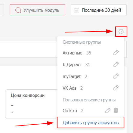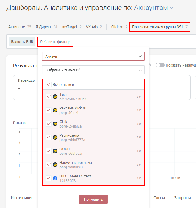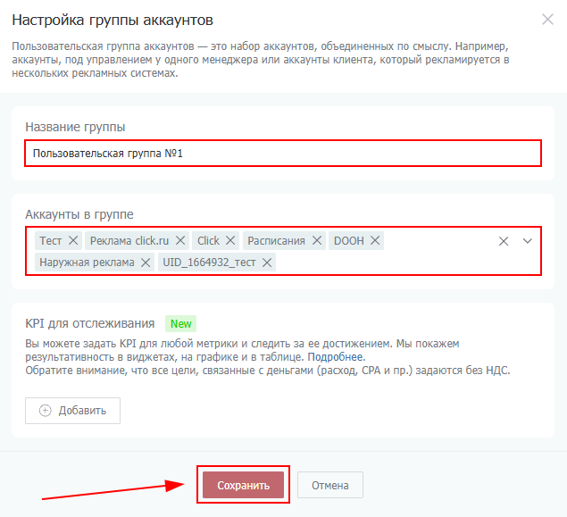 Наша рекомендация — создавать пользовательскую группу из набора аккаунтов для отдельного клиента. Так вы сможете быстро анализировать эффективность рекламы в рамках разных рекламных систем для одного клиента.