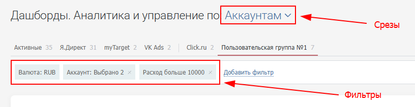 Фильтры — могут играть роль сегмента и фильтра данных в таблице. Например, вы можете просматривать срез по аккаунтам и из всех рекламных аккаунтов выбрать только два. Также можно добавить еще фильтр, указав в нем аккаунты, в которых расход был более 10 000 рублей.
