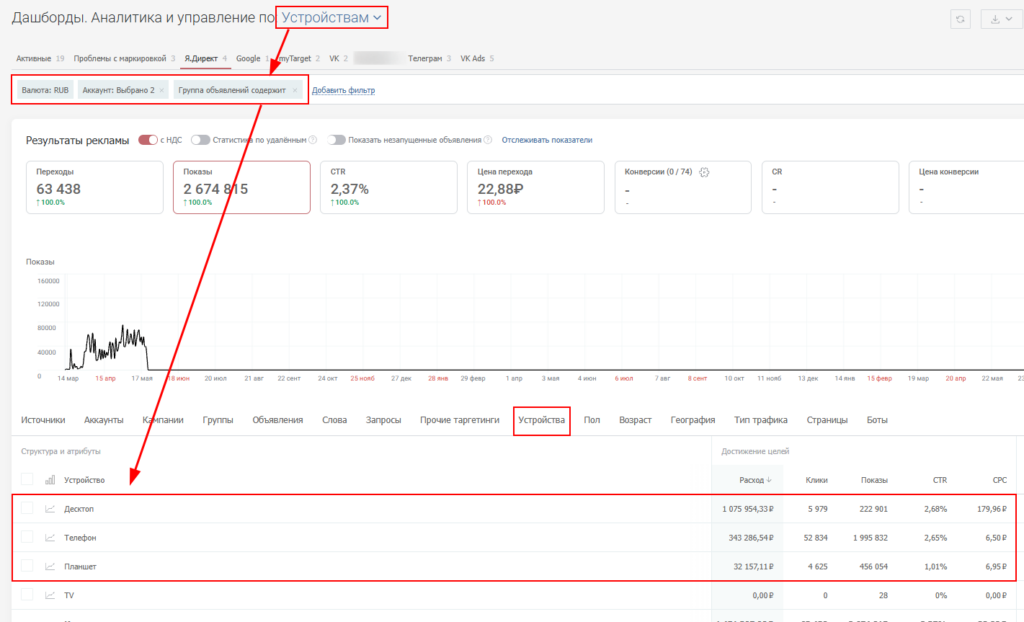 При смене среза на «Устройства» фильтр наследуется, и вы сможете увидеть статистику по устройствам для данной группы объявлений.