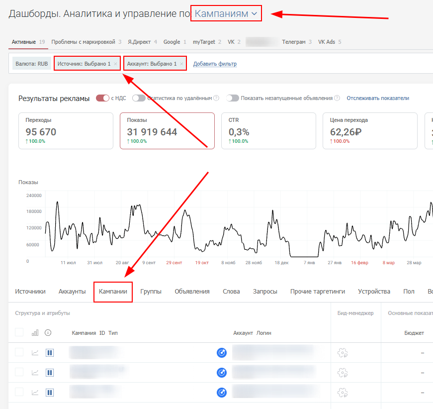 Кликнув на рекламный аккаунт вы перейдете в срез «Кампании», при переходе автоматически добавится ещё фильтр с указанием выбранного рекламного аккаунта.