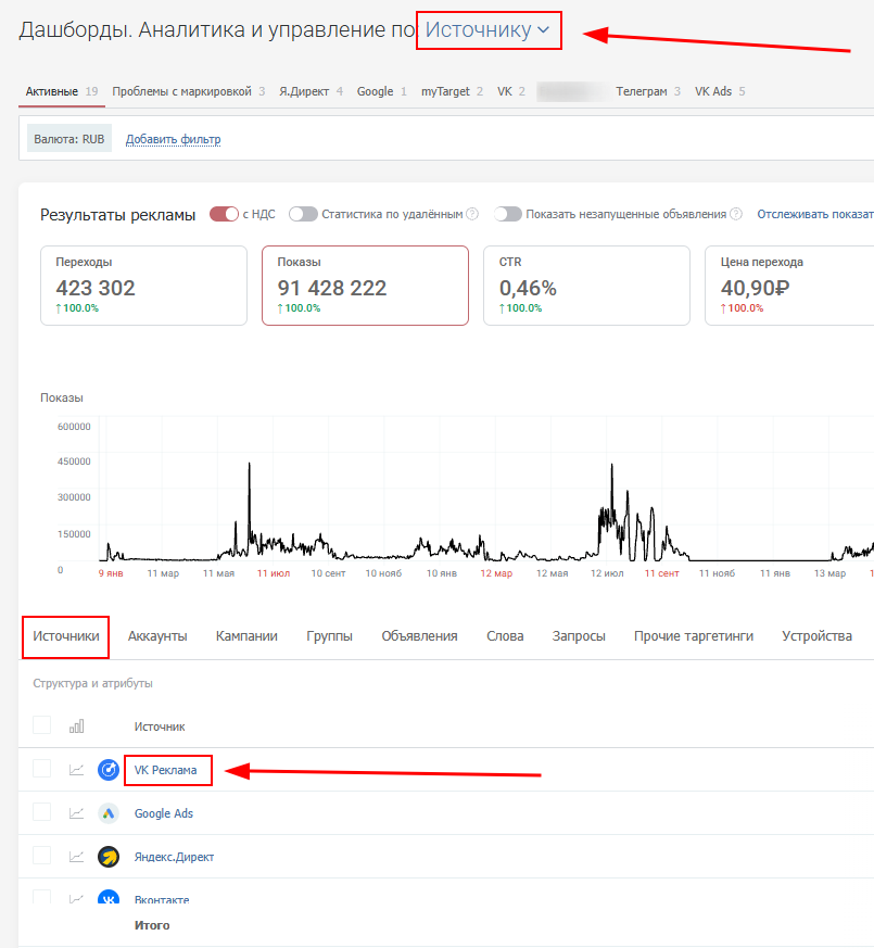 2. По умолчанию вы попадаете в срез «Источники», где видите аналитику по рекламным системам, в которых были созданы аккаунты.