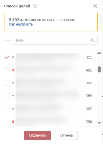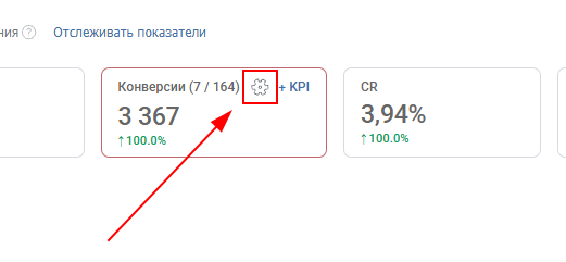 Выбрать нужные цели из списка можно по клику на шестеренку у показателя «Конверсии»: