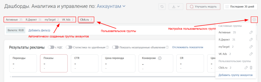 Группы аккаунтов являются сквозными с основной страницей пользовательского аккаунта «Список аккаунтов». Иными словами, вы увидите одинаковый набор групп, который состоит из автоматически созданных группировок (по активности / по типам рекламных систем) и пользовательских групп.