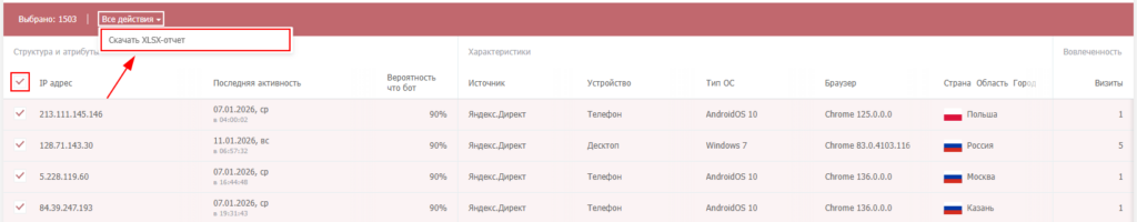 На странице «Дашборды. Аналитика и управление», в срезе «Боты», доступна детализация с информацией о найденных ботах в рамках кампаний. Всю представленную информацию можно выгрузить в XLSX-отчет.