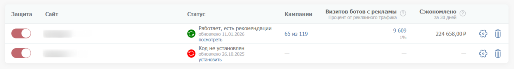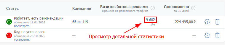 ● Сэкономлено — расчетный показатель. Визитов ботов с рекламы средний CPC за последние 30 дней.