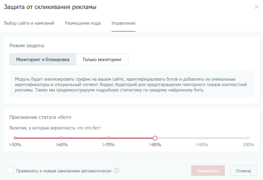 Если остались сомнения, можете использовать режим «мониторинг» в настройках, тогда мы не будем применять корректировки ставок в ваши рекламные кампании, а лишь покажем вам фрод в наших дашбордах. Режим переключается в обе стороны в любой момент.