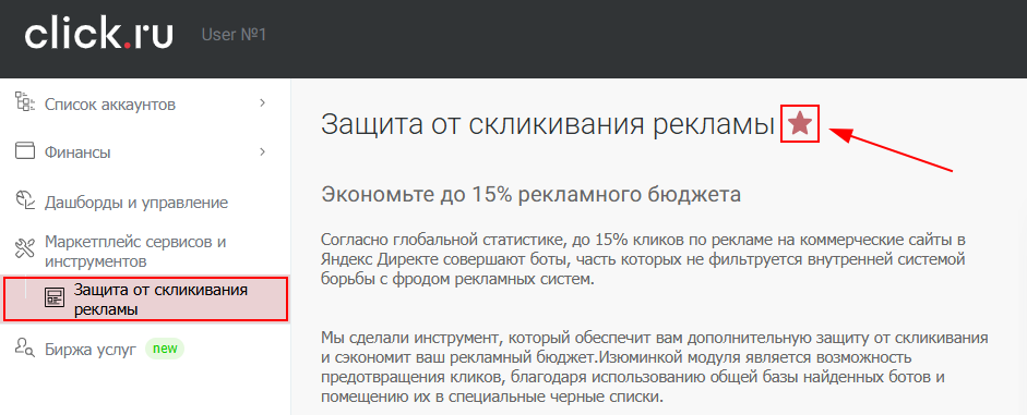 4. Находясь на странице защиты от скликивания нажмите на значок «⭐️» рядом с названием. Так инструмент закрепится в панели слева для быстрого доступа;