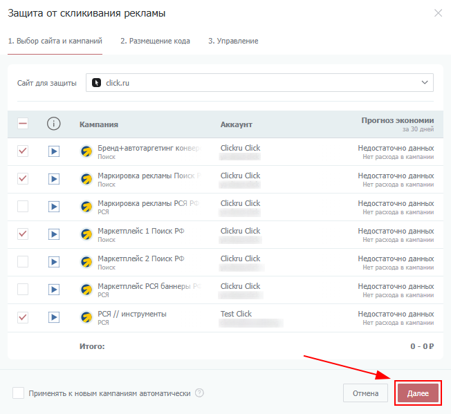 3. Выберите кампании и нажмите кнопку «Далее»;