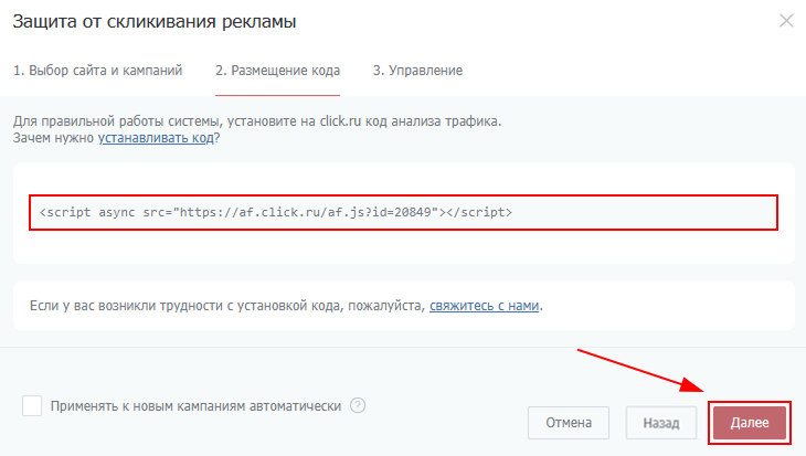 4. Установите предложенный код на все страницы сайта и пройдите проверку установки. Код не замедлит работу вашего сайта — все работает асинхронно. После установки кода нажмите на кнопку «Далее»;