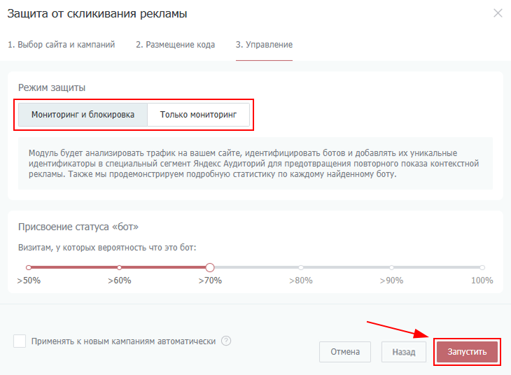 Мониторинг и блокировка (рекомендуется). Модуль будет анализировать трафик, показывать отчеты и предотвращать появление нового фрода на сайте. Дополнительно вы можете настроить вероятность, при которой мы будем фильтровать трафик — от этого будет зависеть сколько трафика будет отфильтровано, функция может быть полезна для узких ниш и рекламных кампаний, где трафика очень мало.