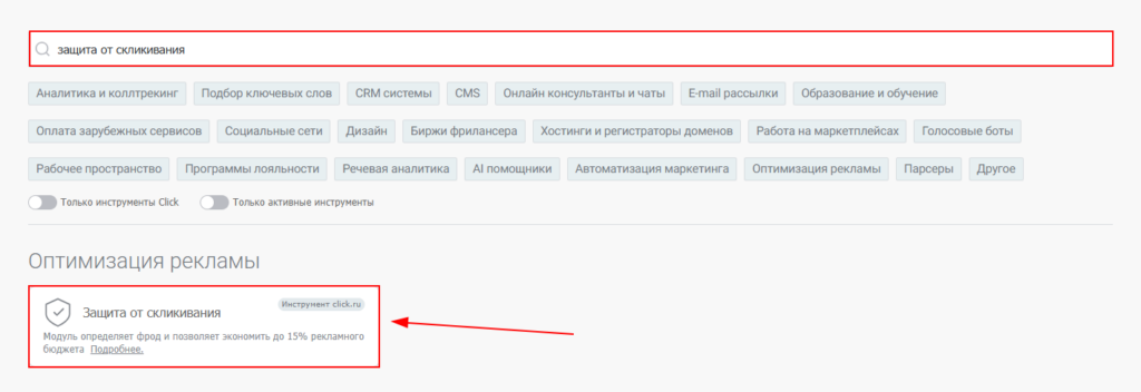 2. Используя поле для поиска найдите и выберите инструмент «Защита от скликивания»;