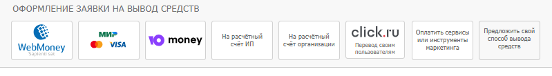 Средства, заработанные в партнерской и реферальной программах для квалифицированных участников рынка, можно вывести на банковские карты, электронный кошельки WebMoney и ЮMoney, на расчетный счет ИП или организации, а также перевести на баланс одного из пользователей для оплаты рекламы, сервисов маркетплейса или услуг на бирже.