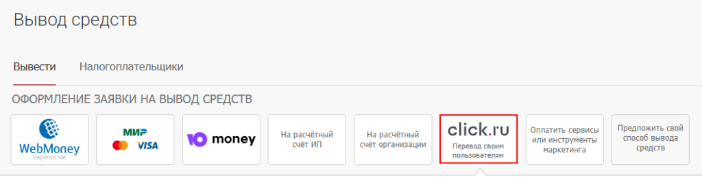 2. На странице вывода средств нажмите на иконку с логотипом Click.ru.