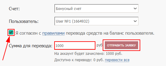 4. Поставьте галочку, чтобы согласиться с правилами перевода и укажите сумму в рублях. Затем нажмите на кнопку «Отправить заявку».