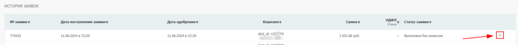 При необходимости, течение 5 минут вы можете отменить заявку. Для отмены нажмите на крестик справа.