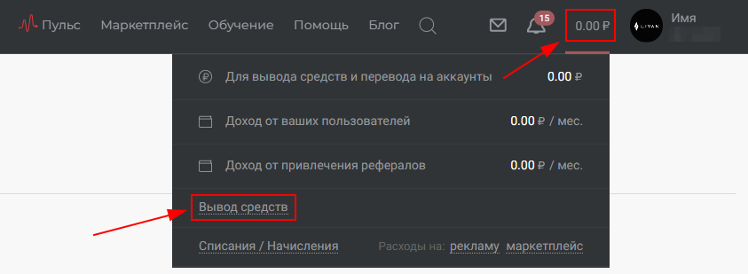 1. Находясь в мастер-аккаунте нажмите на баланс в правом верхнем углу и перейдите по ссылке «Вывод средств».