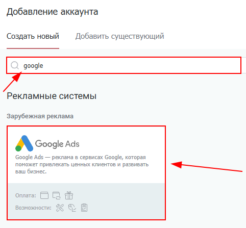 2. Используя поле для поиска найдите «Google Ads» и выберите площадку.