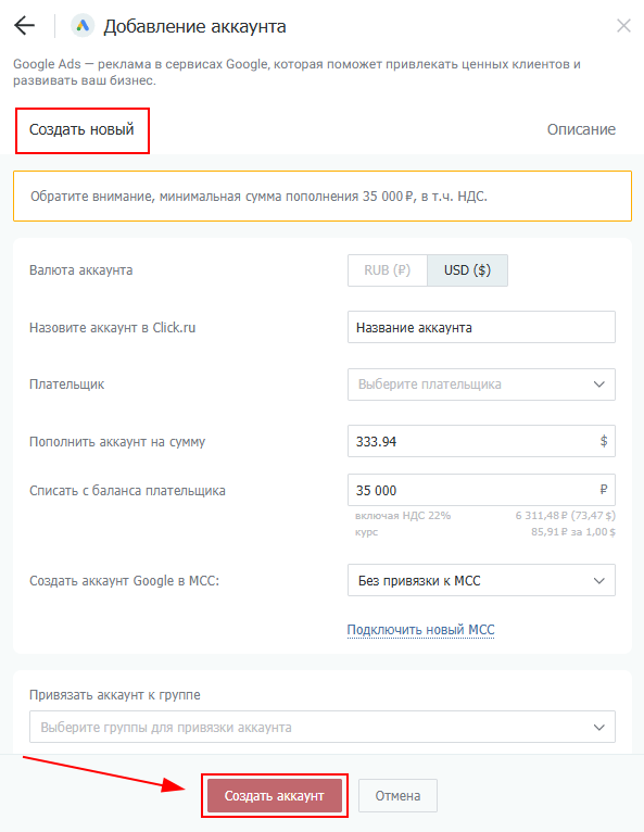Перед подачей заявки на создание необходимо пополнить баланс аккаунта Click.ru на сумму от 35 000 руб. с НДС.