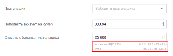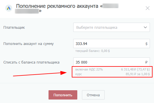 — При пополнении Google аккаунта, происходит перевод рублей в валюту. В окне пополнения баланса рекламного аккаунта, под полем суммы списания вы можете увидеть детализацию: НДС и актуальный курс.