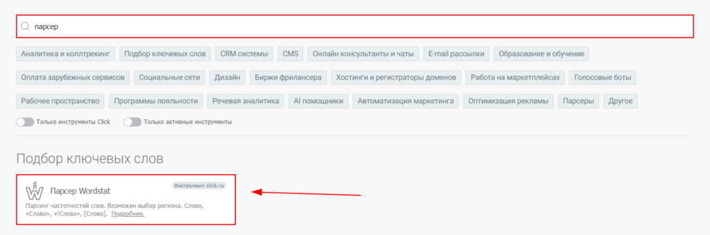 2. Используя поле для поиска найдите и выберите инструмент «Парсер Wordstat»;