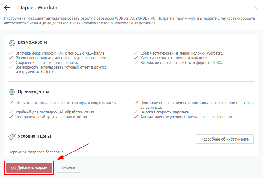 Инструмент позволяет автоматизировать работу с сервисом Wordstat.yandex.ru. За несколько минут, вы с лёгкостью соберете частотность тысяч, и даже десятков тысяч, ключевых слов, в необходимых регионах. Эта информация поможет вам оптимизировать семантическое ядро.