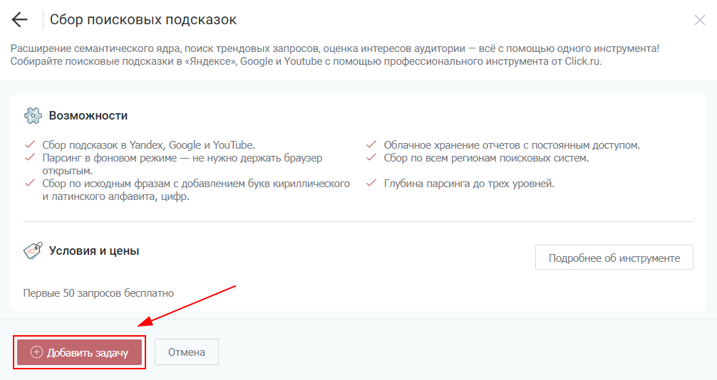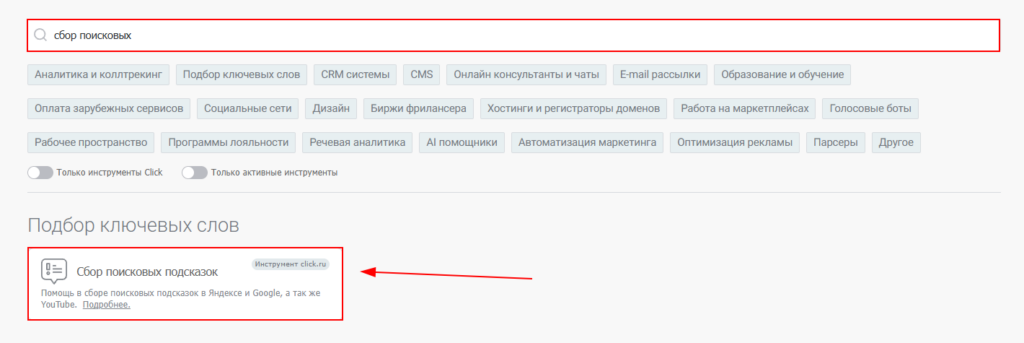 2. Используя поле для поиска найдите и выберите инструмент «Сбор поисковых подсказок»;