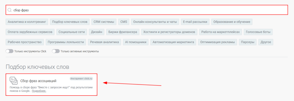 2. Используя поле для поиска найдите и выберите инструмент «Сбор фраз ассоциаций»;