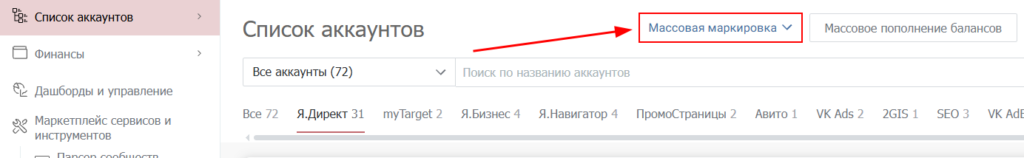 Находясь в списке аккаунтов нажмите на кнопку «Массовая маркировка» в верхней части экрана.