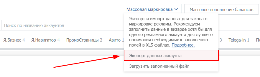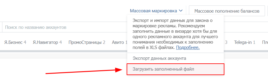 Для экономии времени можно использовать функционал «Массовая маркировка». Он позволяет выгрузить в Excel-файле уже промаркированные рекламные аккаунты и создать схемы для новых аккаунтов.