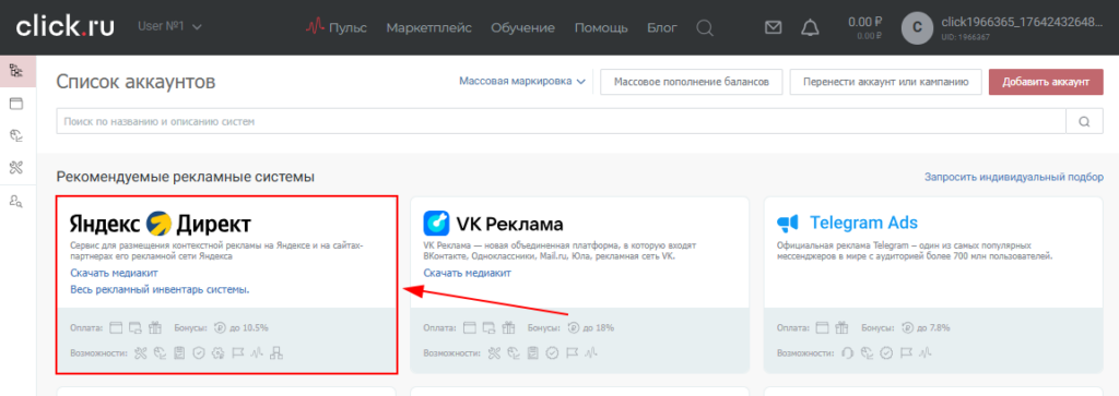 2. В списке аккаунтов нажмите на Яндекс Директ