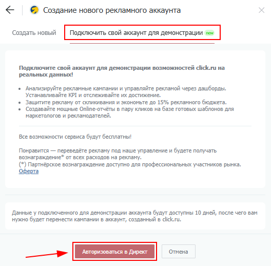 Услуга доступна пользователям Click.ru, которые не имеют активных аккаунтов в Яндекс Директе, созданных через Click.ru.