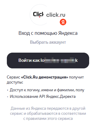Если вы уже авторизованы в Яндекс аккаунте, необходимо подтвердить предоставление доступов для Click.ru.