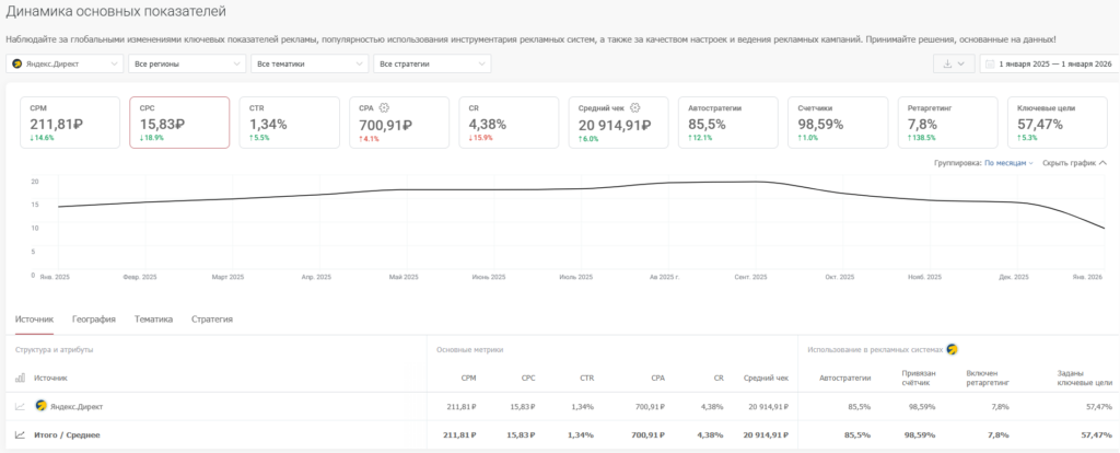 Вы можете наблюдать, как меняются основные показатели рекламы (стоимость кликов, лидов, средний чек и др.) с течением времени. Фильтруйтесь по источникам, регионам и тематике – планируйте свой бюджет и выделяйте средства на наиболее эффективные инструменты рекламы.