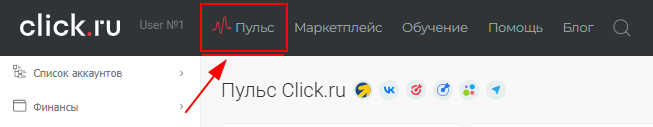 Чтобы перейти к инструменту, нажмите на кнопку «Пульс» в верхнем меню. Для получения доступа ко всем фильтрам и срезам необходимо быть зарегистрированным в Click.ru — это бесплатно.