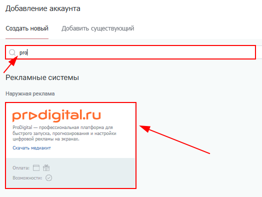 2. Используя поле для поиска введите «Prodigital.ru» и выберите площадку.