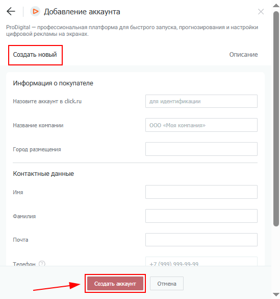 3. Назовите новый аккаунт и заполните необходимые поля, затем нажмите на кнопку «Создать аккаунт».