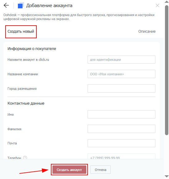 3. Назовите новый аккаунт и заполните необходимые поля, затем нажмите на кнопку «Создать аккаунт».