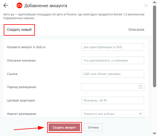 3. Назовите новый аккаунт и заполните необходимые поля, затем нажмите на кнопку «Создать аккаунт».