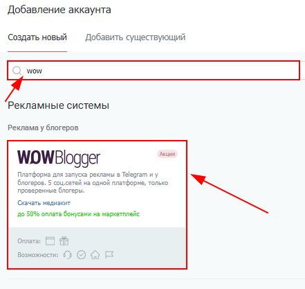 2. Используя поле для поиска найдите и выберите площадку «WOWBlogger».