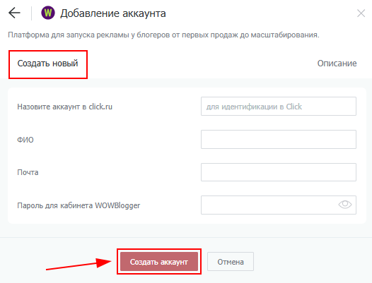 3. Назовите новый аккаунт и заполните необходимые поля, затем нажмите на кнопку «Создать аккаунт».