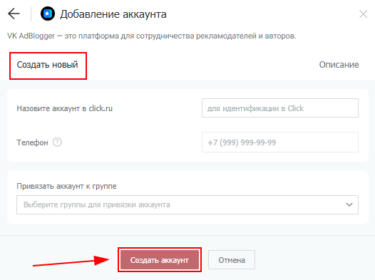 3. Назовите новый аккаунт и заполните необходимые поля, затем нажмите на кнопку «Создать аккаунт».