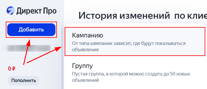 1. Войдите в аккаунт Директа и нажмите на кнопку «Добавить», затем на «Кампанию».