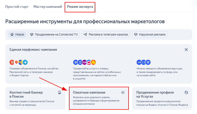 2. Перейдите в «Режим эксперта» и выберите «Охватные кампании»;