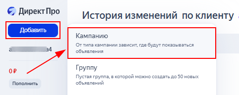 1. Войдите в аккаунт Директа и нажмите «Добавить», затем на кнопку «Кампанию»;