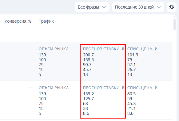 А вот как объем трафика и ставки, выглядят в интерфейсе аккаунта Я.Директ: