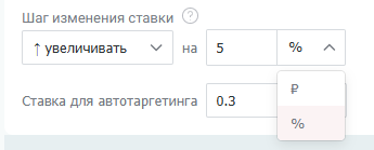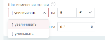 Шаг корректировки ставки можно увеличивать или уменьшать на значение или на процент вплоть до максимальной ставки или списываемой цены.