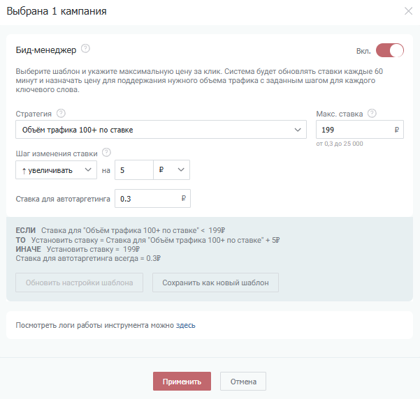 Инструмент, позволяет задать желаемый объем трафика, размер максимальной ставки или размер максимальной списываемой цены и управлять этим в автоматическом режиме.