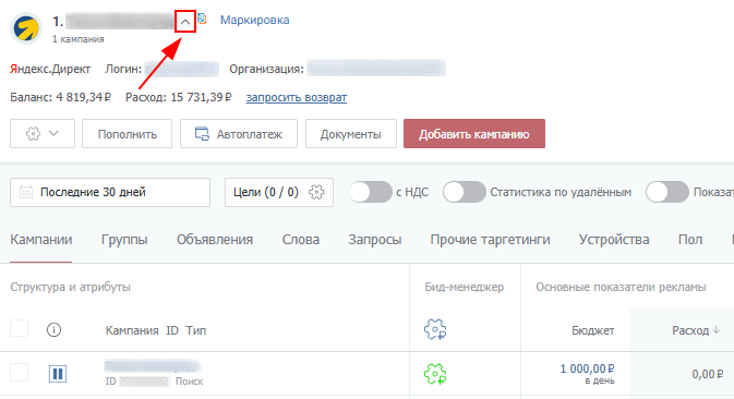 Разберем настройки на примере рекламных кампаний. Для начала работы с функцией управления ставками раскройте список рекламных кампаний нужного аккаунта Яндекса.