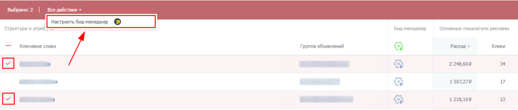 Выделите нужные слова, затем раскройте меню «Все действия» и нажмите на «Настроить бид-менеджер».
